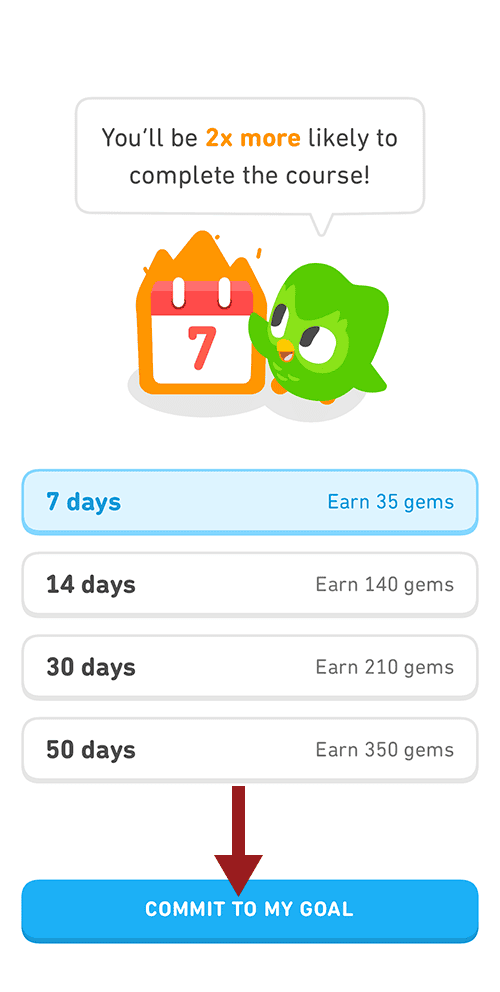 Streaks are the primary way Duolingo helps you build a habit of practicing every day. The app prompts you to commit to a “Streak Goal” for your learning. Push notifications prompt you not to lose your streak, but if you know you’re going to miss a day, you can purchase “Streak Freezes” with earned Gems.