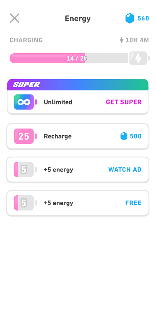 Duolingo quips that Energy “powers your learning.” Every free user begins with 25 units of energy and every question answered costs 1 unit. If you answer several correctly in a row, you may earn back a few energy units (= variable reward). Energy can also be gained through Streaks, ads, Gems, time (recharges daily), or a subscription (“unlimited energy”).
