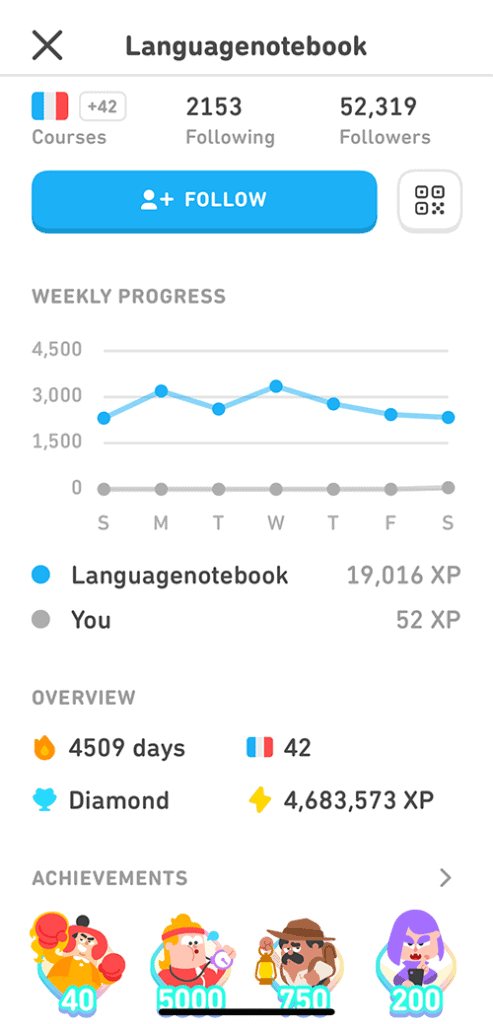 Interestingly, our test account did not follow anyone, nor did anyone follow us. Yet, we were still given a feed of random “learners” milestones. This allowed us to tap on random profiles to see their stats. From here, we could follow this person or any of the thousands that has “hearted” the post. A quick way to connect with strangers (who cannot offer true, meaningful connection).
