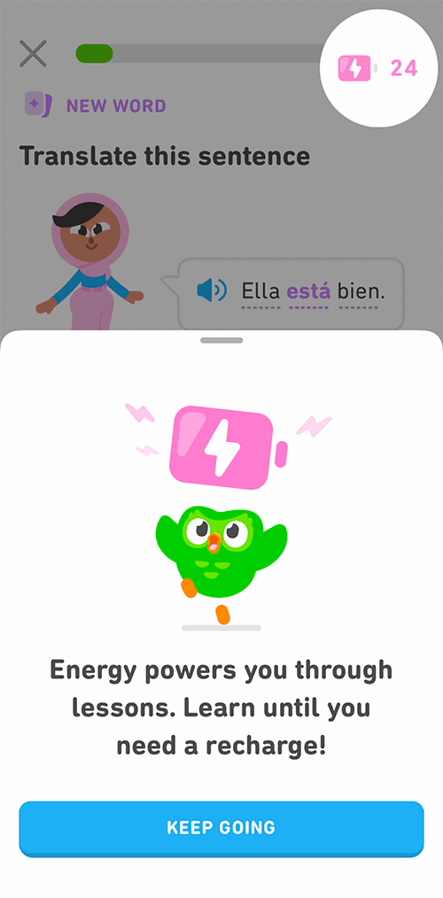 The Energy system is a recent change from the former “hearts” that penalized mistakes and locked you out of the app. Energy, Duolingo claims, promotes balanced learning and increases motivation compared to the old system.