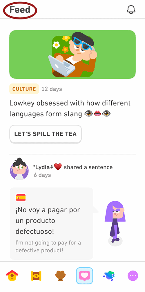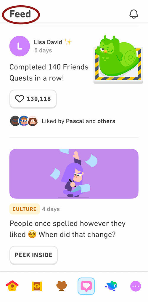 Duolingo offers a feed, much like social media platforms, that displays the learning milestones, achievements, and shared sentences of those you follow. The purpose undergirding this feature is social connection and motivation. The Duolingo blog says that “learners” are 5.6 times more likely to finish their course when friends can see their progress. “Learners” can cheer friends on as they reach milestones by “hearting” the post.