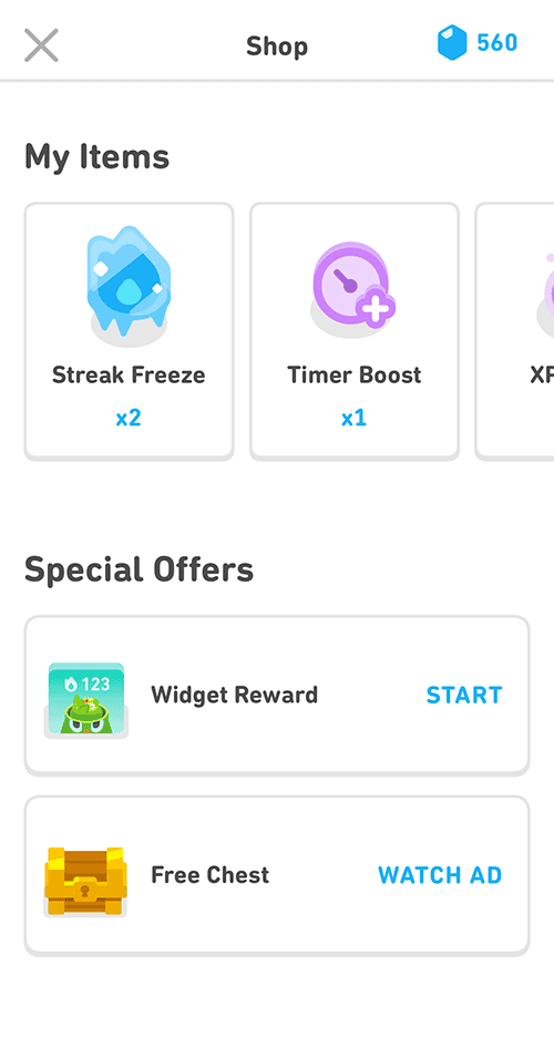 Notice how, in the Shop, special offers such as a reward for adding the widget and a free chest for watching an ad are promoted.