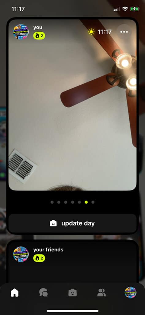 While there are no public feeds, follower counts, or explore/discover pages, the “home page” consists of a TODAY block for your pictures and a YOUR FRIENDS block for their pictures. The TODAY block encourages you to take pictures throughout the day (“UPDATE DAY”), which friends can then scroll through.
