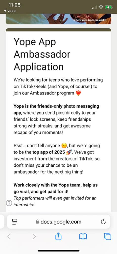 Yope has built an ambassador program to drive awareness of the app. By providing payouts to “power users” who post about the app on other social platforms like TikTok and Instagram, the app has gained visibility among Gen Z and Gen Alpha. Yope said that ambassador videos have had over 56 million views.