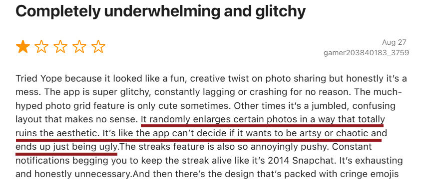 Their app description states, “on Instagram, you’re performing. on Yope, you’re just living.” It states that Yope was created because social media became too fake with filters, edits, likes, and all the noise. The core idea of the app is that there is no “unknown audience” you are posting for – only the people you care about.