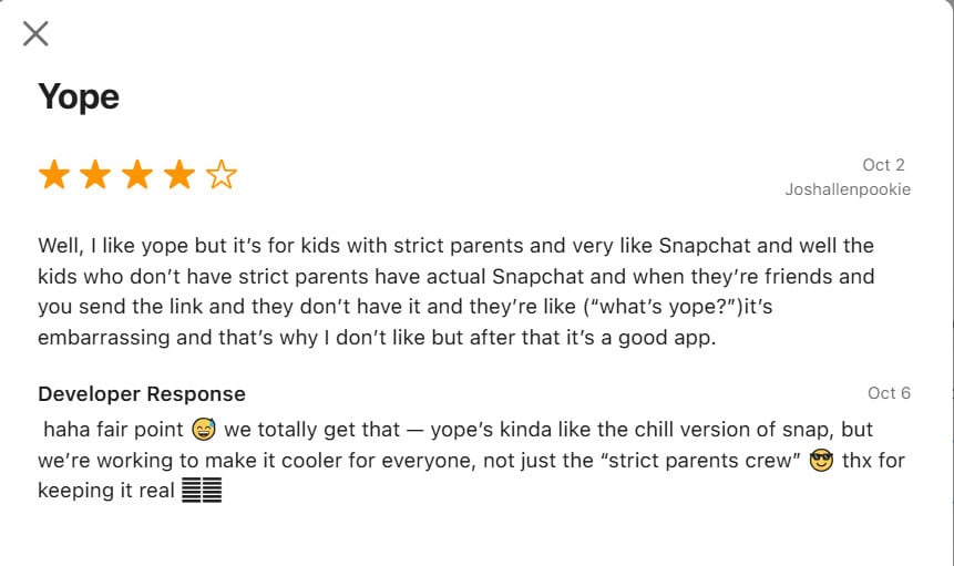 For teens who desperately want Snapchat (but you won’t allow it – good for you!), Yope is a possible alternative. Humorously, an app review commented exactly this: