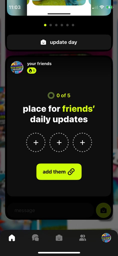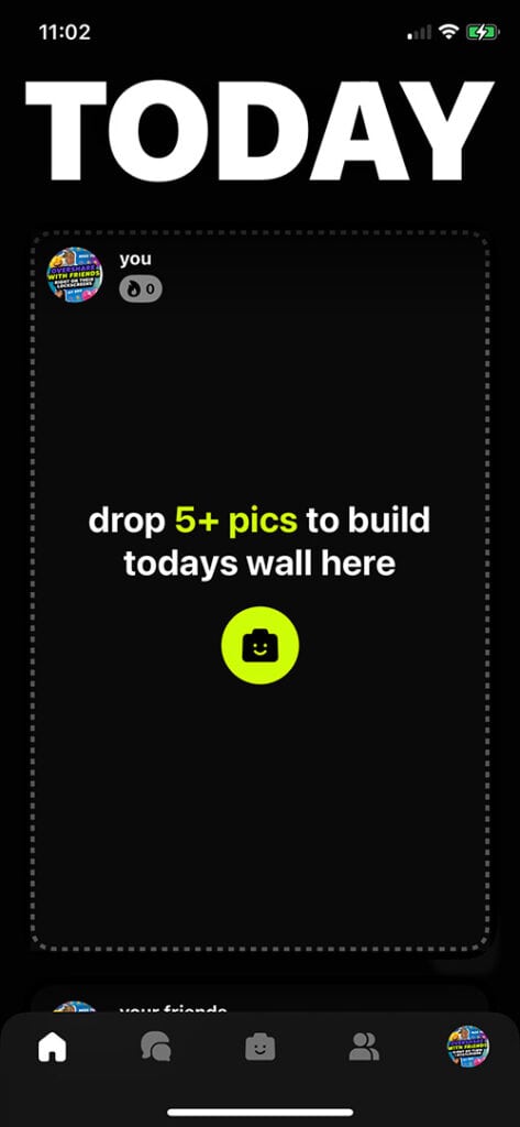While there are no public feeds, follower counts, or explore/discover pages, the “home page” consists of a TODAY block for your pictures and a YOUR FRIENDS block for their pictures. The TODAY block encourages you to take pictures throughout the day (“UPDATE DAY”), which friends can then scroll through.
