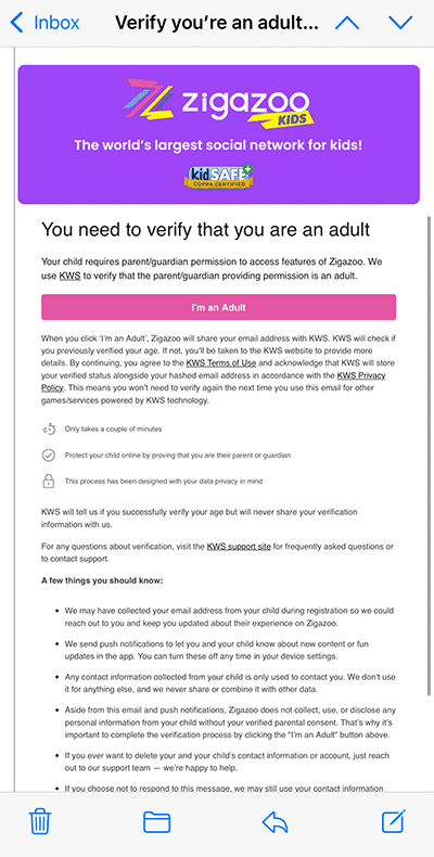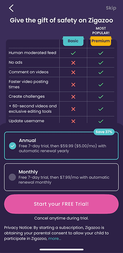 The Zigazoo website states: “Safety isn’t just a feature – it’s a foundation.” To be sure, the elimination of Direct Messaging and the abundance of human moderation help the platform remain “safe” – but only if “safe” means a diminished presence of predators and bullies.