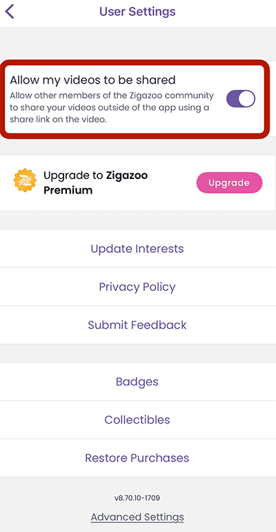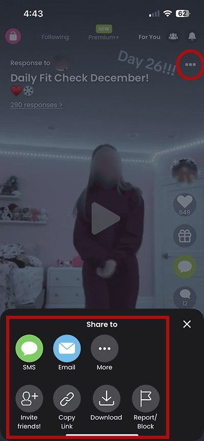 Perhaps the most disturbing feature of the app is the ability to freely share any/all content. By tapping the three dots in the upper right, users can text, email, copy the link, or download any video (below left). Unless the user turns this feature off under profile settings (below middle and right), the default is full share.