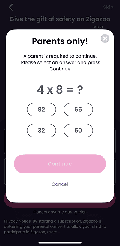 Our 8-year-old account signed up for the Premium membership’s 7-day trial. The only additional step was a multiple-choice math question labeled “Parents only!” Certainly, they must realize that kids have phones and iPads with calculators, even if they don’t recall what 4×8 equals, they can figure it out.
