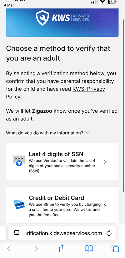 The app offers verification through a (1) photo with a parent, (2) an upgraded subscription from Premium to Premium+, (3) the last 4 digits of SSN, or (4) a credit or Debit card.
