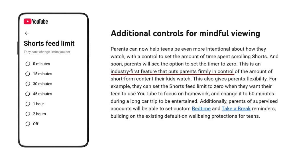 But now we have new “Teen Safety” parental controls for YouTube Shorts, allowing parents to set a timer for use (even to ZERO), which sounds like great news.